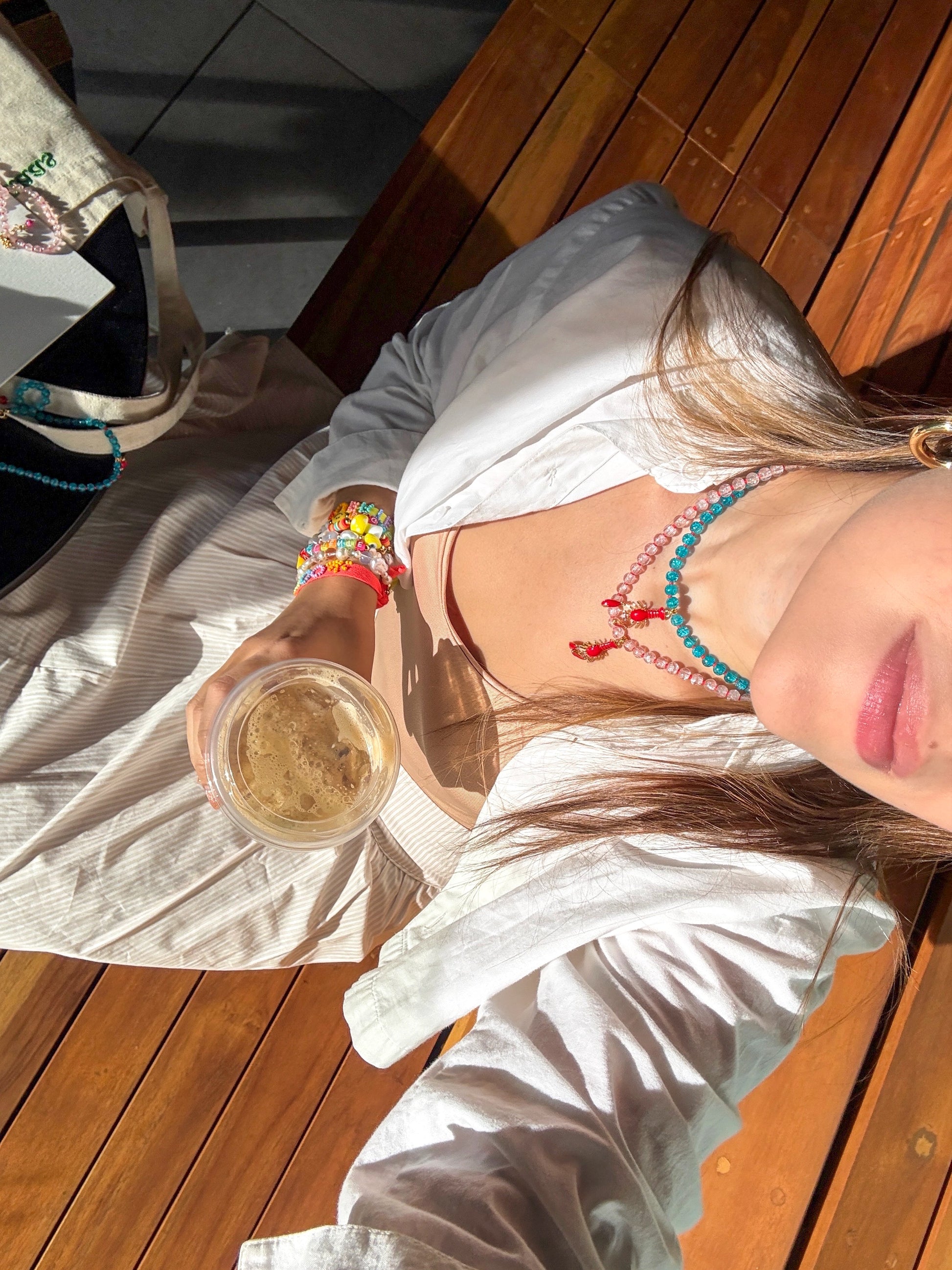• Hecho a mano con dije en rodio, piedras de vidrio y mostacilla.