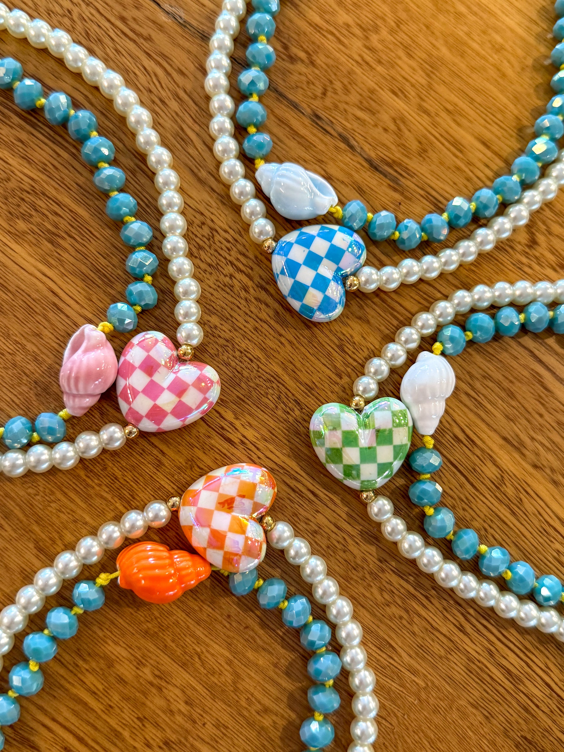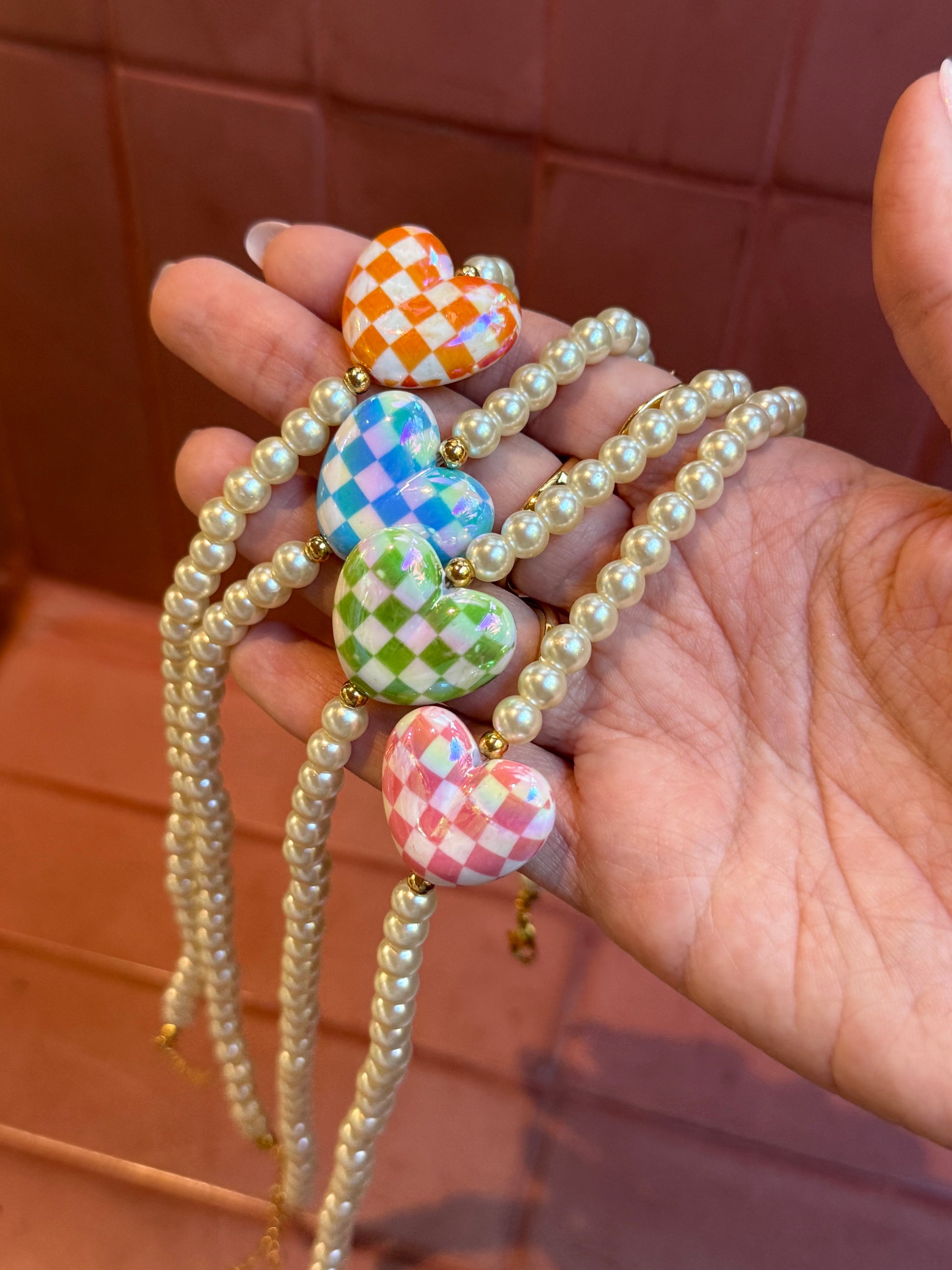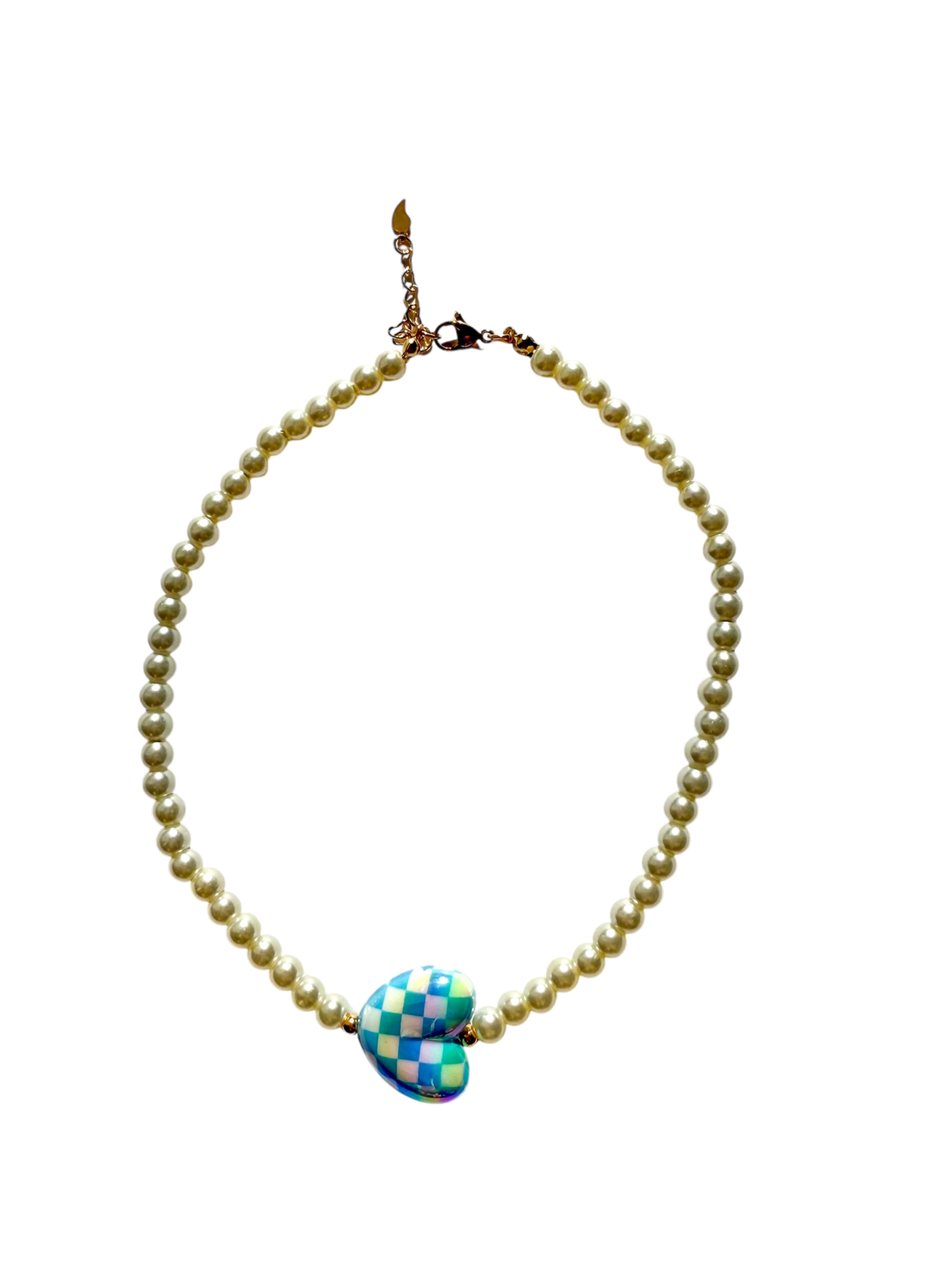• Hecho a mano con perlas, corazón en acrílico y detalles en baño de oro.