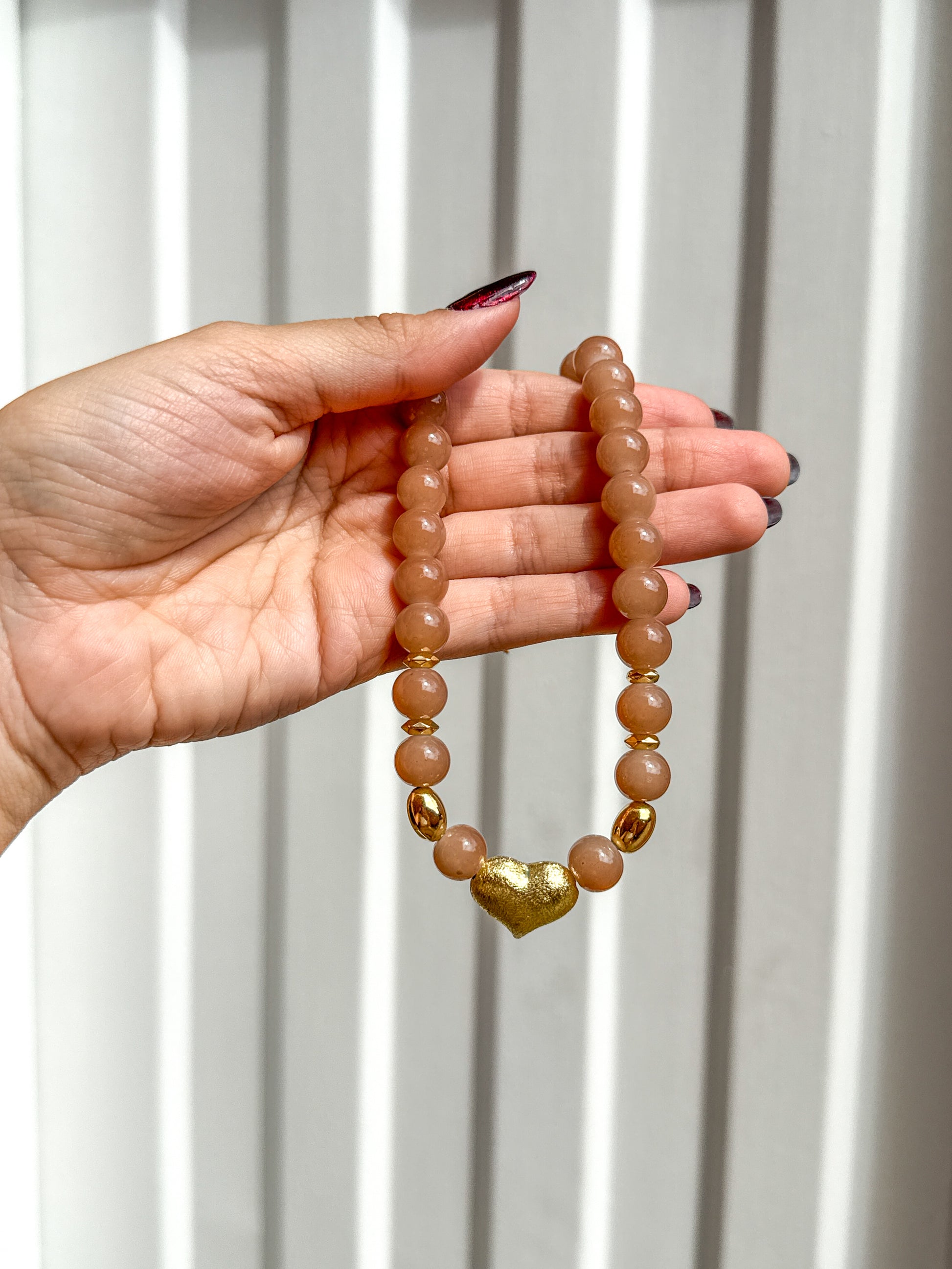 • Collar hecho con piedras en tonos nude y corazón dorado como protagonista.