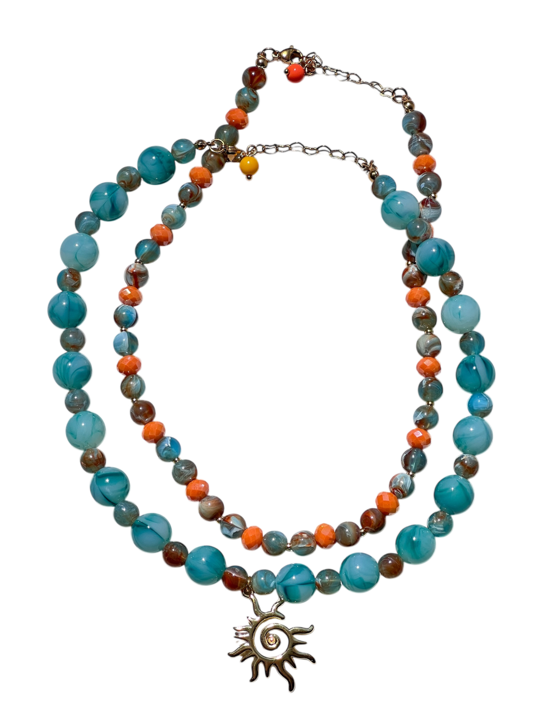 Mermaid mezcla tonos turquesa con un dije dorado que recuerda al sol y al movimiento del agua. Un collar que se siente fresco, luminoso y mágico.