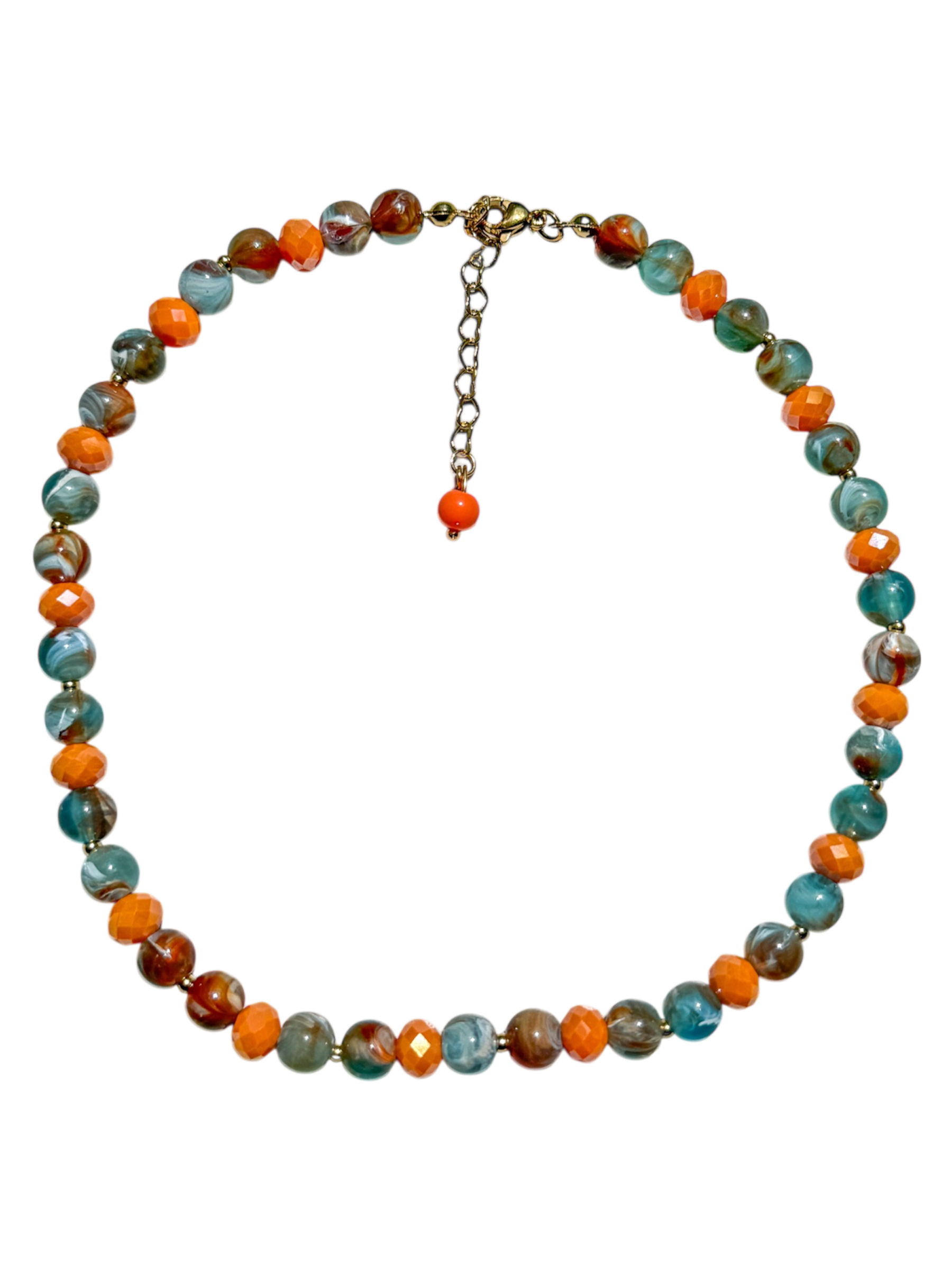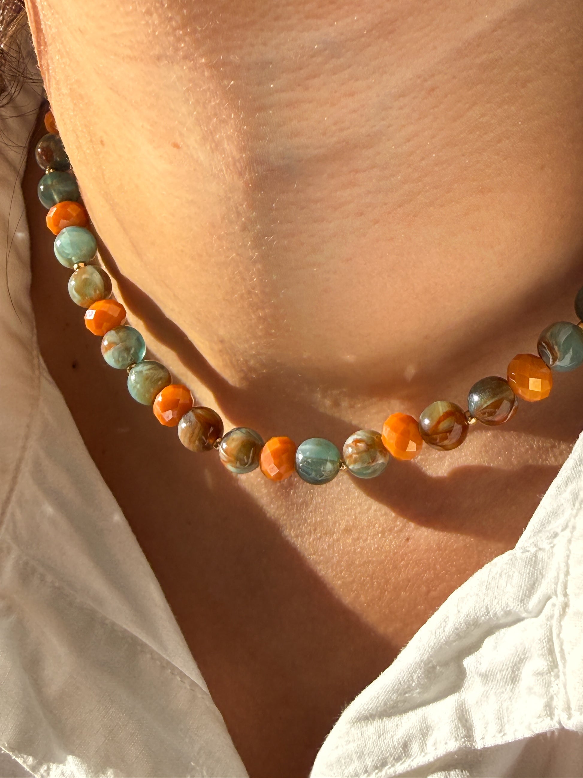 Tisha combina tonos verdes y naranjas en un diseño sutil pero lleno de intención. Perfecto para usar solo o en layering, cuando quieres algo sencillo pero con un twist.