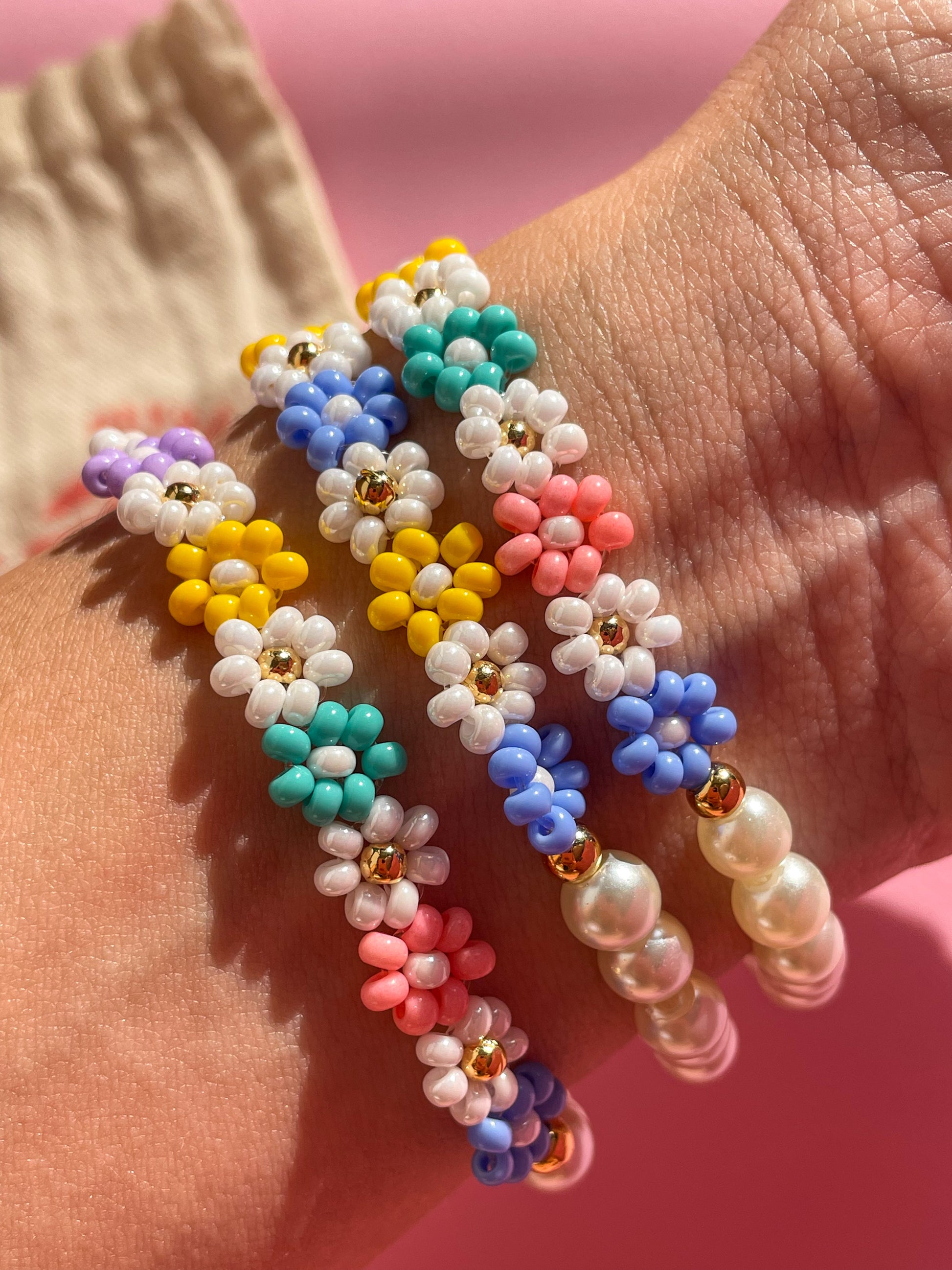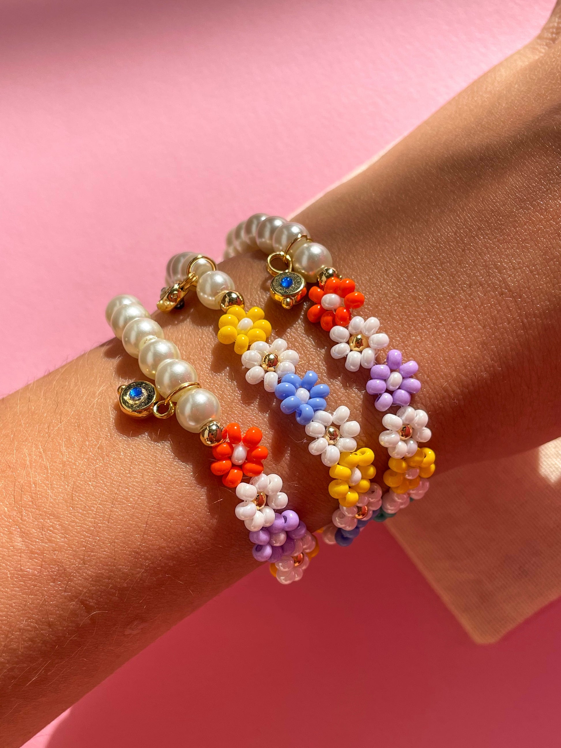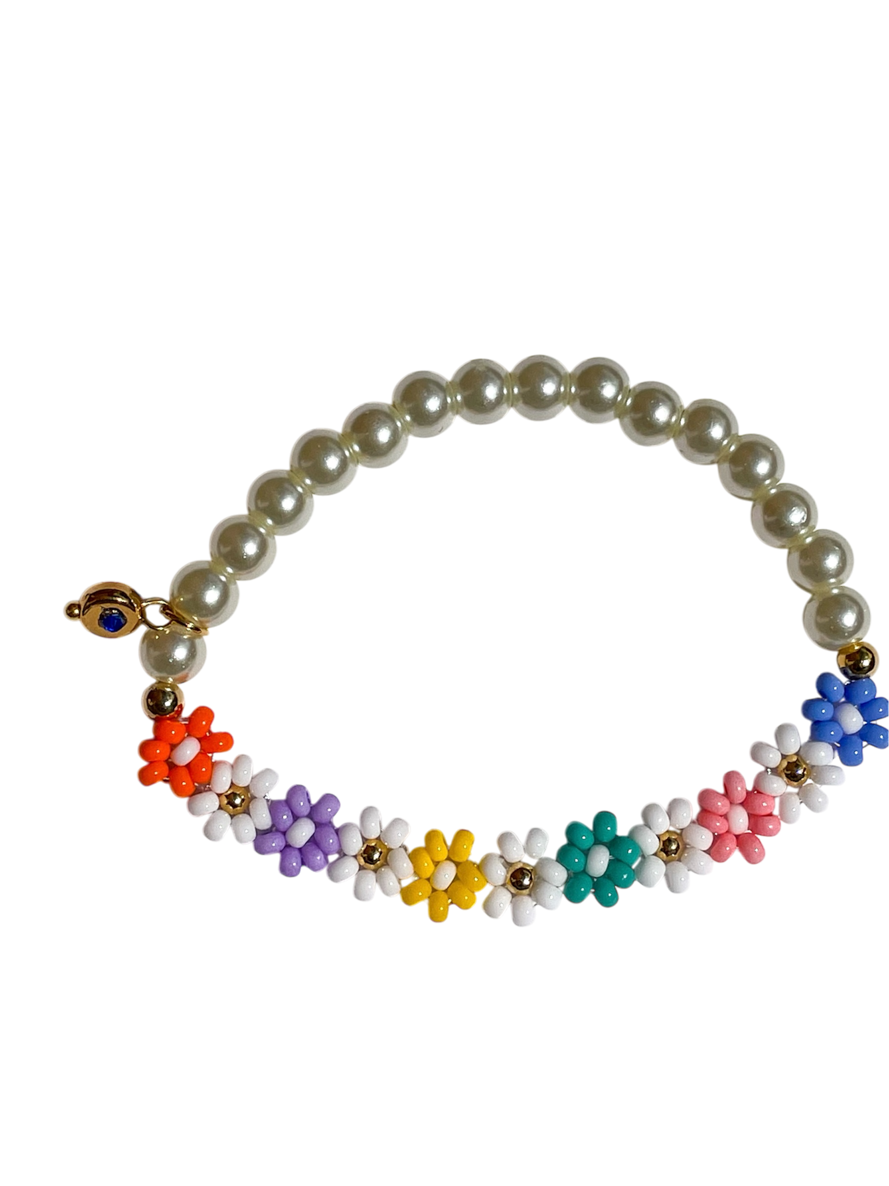 • Manilla con perlas y flores coloridas tejidas a mano.