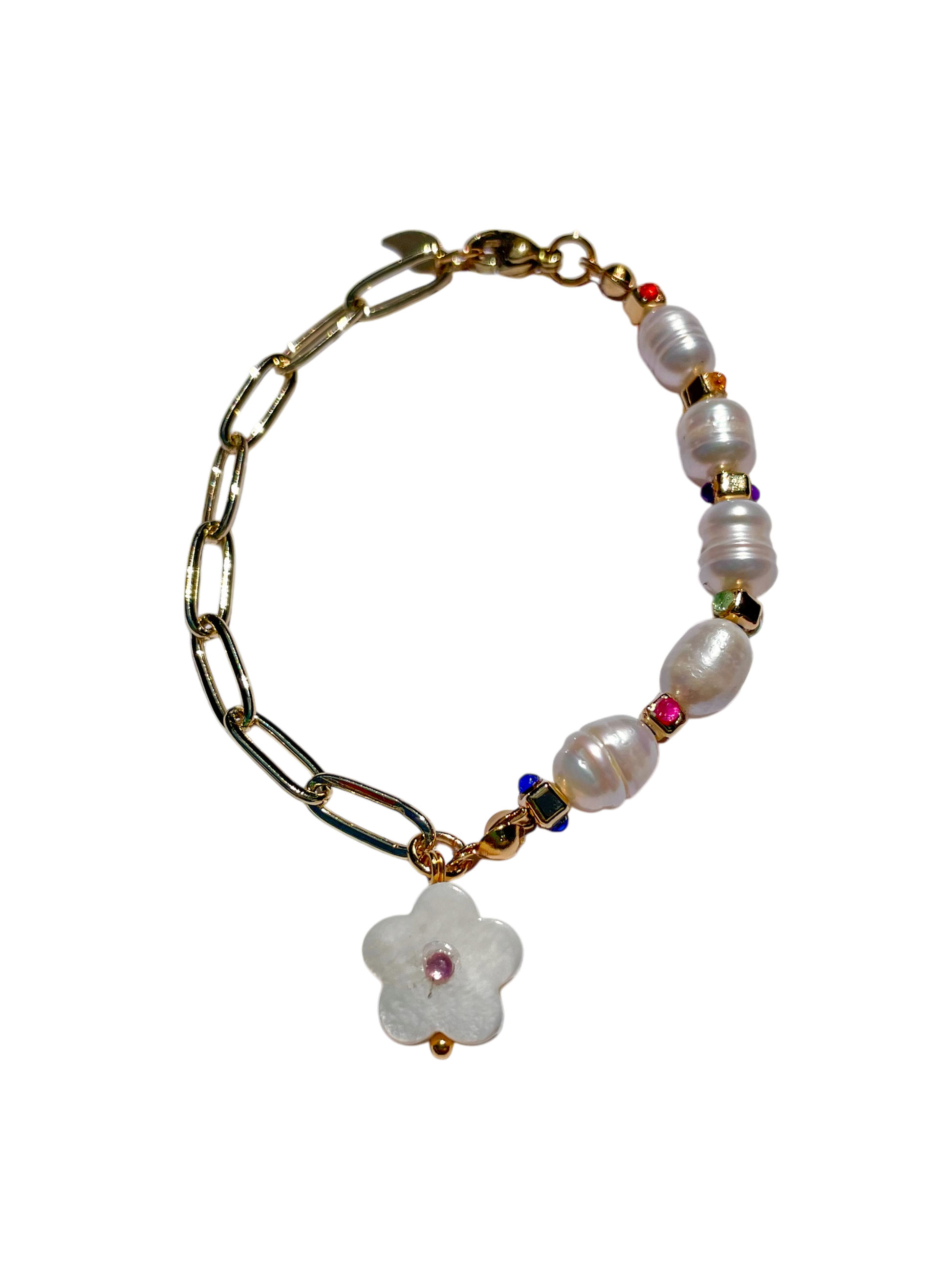 Pulsera con perlas, piedras brillantes de colores, cadena en rodio y un dije de flor único que te hará destacar. Es perfecta para usar en el día a día y combinar lo clásico con un poco de diversión.
