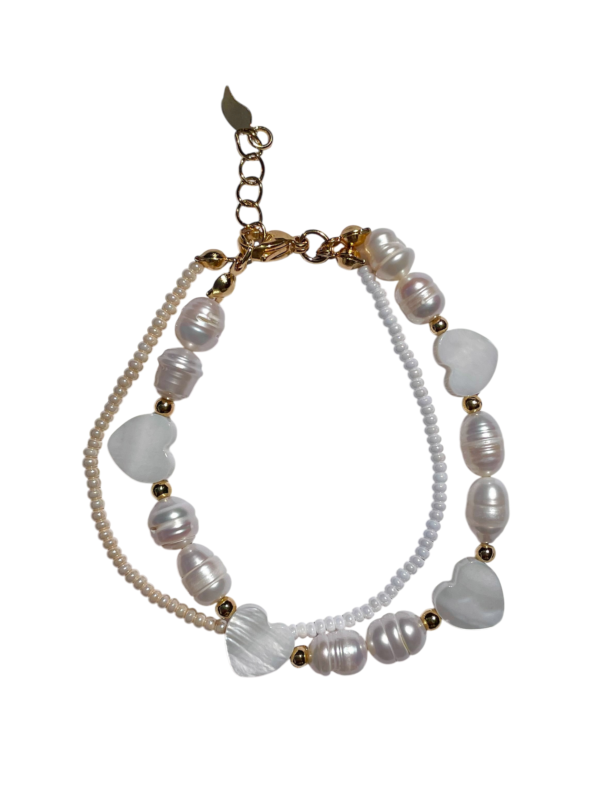 • Hecha a mano con perla de río, nácar y detalles dorados en baño de oro.